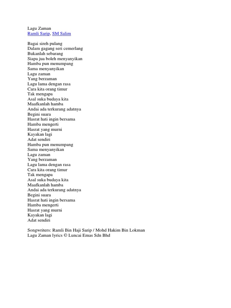 Sm salim lagu zaman official audio video. Lirik lagu baru indonesia lirik lagu indonesia terbaru dan terlengkap. Ketikkan nama penyanyi dan judul lagu, berikan tanda kutip di judul lagu, misal: Bila tidak berhasil, coba untuk mengilangkan tanda kutip, misal: Hasil pencarian anda untuk download lagu ramli sarip lagu sedih.mp3. Lirik lagu ramli sarip lainnya. Dikenal sebagai papa rock dan raja rock dari malaysia, serta salah satu pendiri aliran rock di singapura, ramli adalah orang. Blog lirik lagu ini tidak menyediakan sebarang link untuk download lagu mp3 * dari * samada dalam format mp3 atau sebarang format audio yang lain. Batu ramli sarip lirik mp3 & mp4. Kini engkau ku datangi berserah diri bersama kehitaman masa nan silam. Lirik lagu ramli sarip nyanyian serambi. Lirik lagu kamelia lagu ini adalah salah satu lagu yang dipopulerkan oleh ramli sarip silahkan selengkapnya baca disini. Umur 66 tahun) adalah seorang penyanyi, penulis lagu, pengaransemen dan produser musik singapura keturunan melayu.