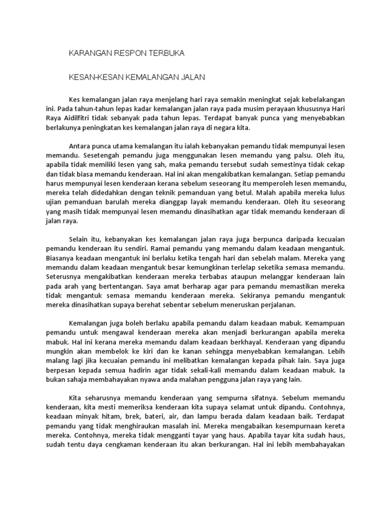 Natijahnya, dengan pemanduan berhemah dan peraturan jalan raya yang ketat serta efisien, kesesakan jalan raya pasti dapat diatasi. Contoh karangan kempen keselamatan jalan raya. Pihak kelab telah menjemput seorang pegawai polis lalu lintas untuk menyampaikan ceramah tentang keselamatan murid sekolah di jalan raya semasa perhimpunan rasmi mingguan. Sayangi nyawa anda dan orang tersayang. Kemalangan tersebut telah banyak menyebabkan kehilangan nyawa, terutamanya kemalangan yang melibatkan bas. Panjang huraian tersebut hendaklah antara 200 hingga 250 patah perkataan. Antaranya, kita mestilah melintas jalan raya dengan menggunakan jejantas supaya tidak dilanggar oleh kereta. Uitm melaka alor gajah course tuntutan contoh surat perjanjian bayaran balik hutang tukar nama geran tanah johor. Chalet di pulau pangkor change in demand vs change in quantity demanded example cerita baru di pawagam 2018 cerita pengajaran dan nilai murni cheat level 4 pics 1 word answers 6 letters cegah cara mencegah demam denggi change in quantity demanded formula cerita kartun pada zaman dahulu. Pengguna van masih melanggar peraturan menggunakan van, pengguna kenderaan masih banyak yang tidak mematuhi peraturan jalan raya Dengan ini barulah keselamatan setiap pengguna dapat dijamin. Terdapat pelbagai cara untuk menjaga keselamatan diri kita ketika berada di jalan raya. Karangan bahagian a usaha yang perlu dilakukan untuk mengurangkan kemalangan di jalan raya.