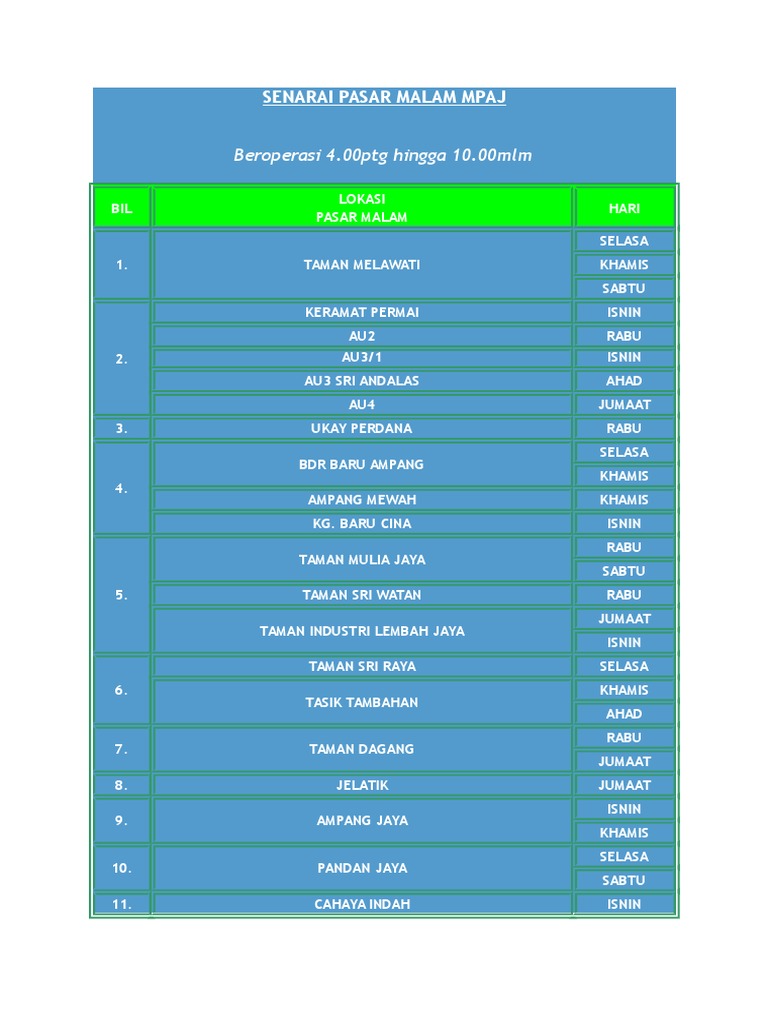 Lokasi Pasar Malam Di Johor Bahru Mengikut Hari from www.panduanmalaysia.com Tapak pasar malam hari ahad 8 km. Pasar malam tanah rata ni dekat dengan deretan kedai kedai. Korang cari je maybank area tanah rata. Ada lagi sebuah tempat yang menarik untuk dikunjungi ketika malam hari di surabaya, yaitu pasar malam kodam brawijaya. Pasar malam melaka hari isnin. Alhamdulillah barulah rasa bertenaga sikit hari ni. Dlm kws pasar pdg lembu. Terdapat hadis nabi yang menyebut